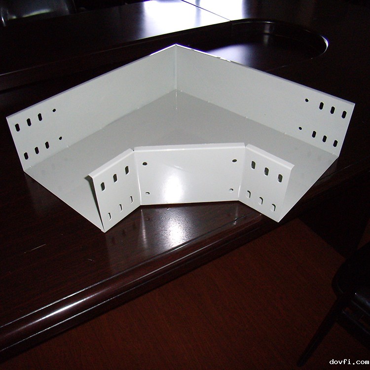 一种电缆桥架水平90度弯头制作方法,将中间的一段桥架的底板切成等腰梯形,分别与等腰梯形底板相连的桥架的两个边为矩形,然后将两端的桥架左右互换,分别与中间的一段桥架对接,后进行焊接固定。中间的一段桥架的等腰梯形底板,其腰与下底边的角度为67.5度。电缆桥架配件具有不用切除桥架,节省材料,简便易行的优点,电缆桥架配件适用于电缆槽板桥架和梯形桥架的施工。